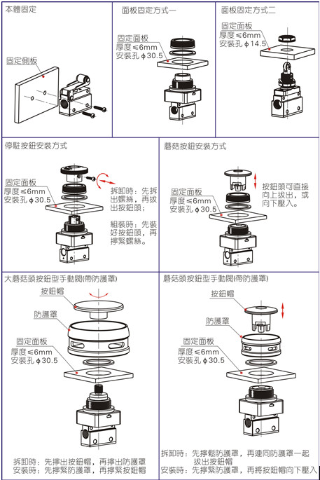 1、安裝方式有:本體固定方式、面板固定方式 、面板固定方式二、停駐按鈕安裝方式、蘑菇按鈕安裝方式,具體如下圖所示;