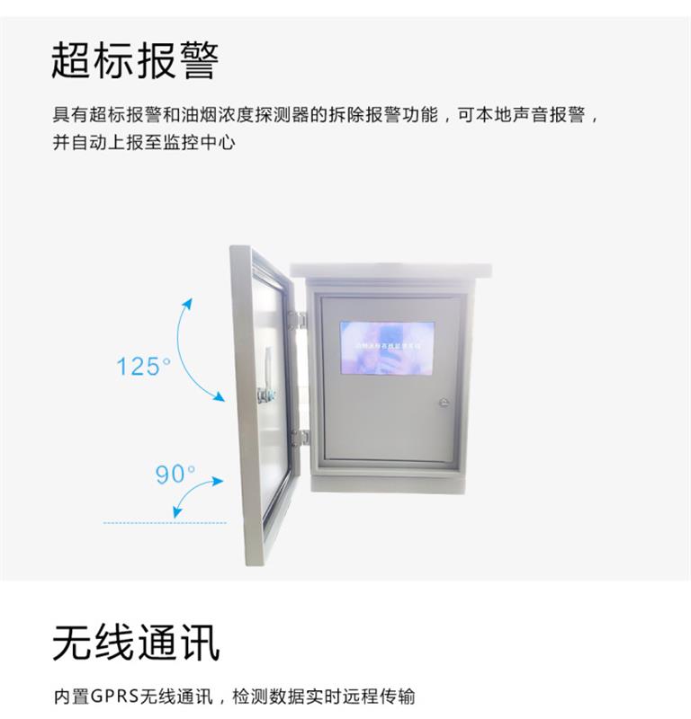 是可實現(xiàn)油煙排放濃度實時監(jiān)測的儀器,其主要由構(gòu)成由采集器主體、顯示屏、油煙探頭三部分。內(nèi)置物聯(lián)網(wǎng)3G/4G模塊,采用實時在線、自動上傳的方式工作。采集器帶有油煙探頭專用接口,用于連接探頭。采集器通過控制探頭采集油煙原始數(shù)據(jù),讀取探頭采集到的原始數(shù)據(jù),并進(jìn)行計算,*終得到油煙濃度值,可以在顯示屏上直接讀取數(shù)據(jù)。油煙在線監(jiān)控系統(tǒng)由實時數(shù)據(jù)監(jiān)測、歷史數(shù)據(jù)查詢、基礎(chǔ)信息管理、用戶信息管理等幾部分功能組成。