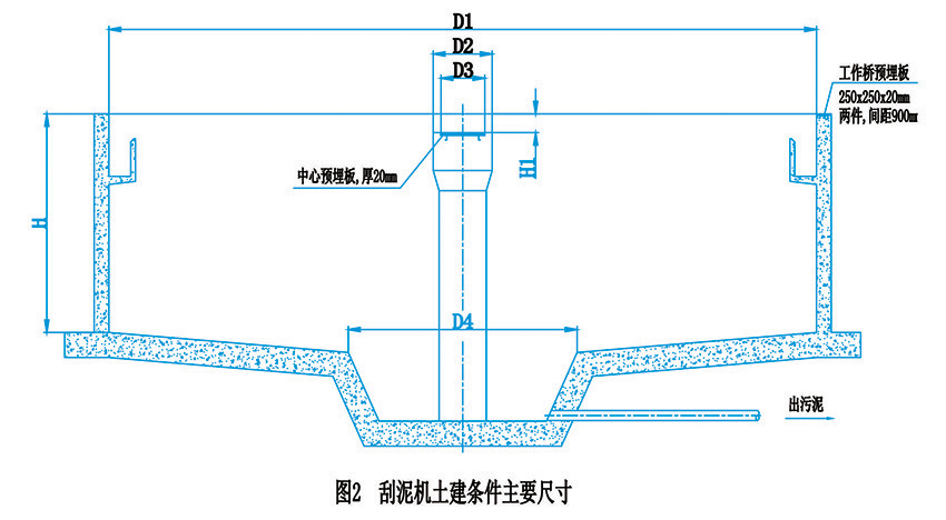 原水經(jīng)中心配水筒布水后呈輻射流向池子周邊溢水槽,隨著流速的降低,水體中的懸浮物被分離而沉降于池底,上清液通過(guò)溢流堰板由出水槽排出池外。通過(guò)減速驅(qū)動(dòng)和懸掛式組件的傳動(dòng),由刮板將污泥刮集到中心集泥槽,依靠靜水壓力或泵排出池外。采用中間進(jìn)水和排泥,周邊排水,保證水流均勻。利用液位差自吸式排泥,有浮渣刮集排除裝置和過(guò)載保護(hù)裝置。
