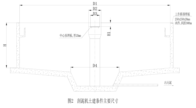 中心傳動垂架式刮泥機如圖 1 所示由集渣斗 1、刮渣板 2、支架 3、撇渣板 4、導流筒 5、驅(qū)動裝置 6、工作橋 7、旋轉(zhuǎn)豎架 8、刮臂 9、小刮板 10、刮泥板 11 等組成。固定在旋轉(zhuǎn)豎架上的刮臂在驅(qū)動裝置帶動下, 繞池中心軸線旋轉(zhuǎn), 將沉積在池底的污泥由刮泥板刮集至池中心集泥坑,同時,液面上的浮渣向隨導流筒旋轉(zhuǎn)的撇渣板和周邊浮渣擋板形成的漸縮區(qū)域內(nèi)集中,直至其封閉邊—刮渣擺臂。當擺臂抵達集渣斗時,由擺臂上的刮渣板刮集至集渣斗排出池外。