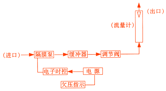 儀器主要部分由隔膜泵、調(diào)節(jié)閥、緩沖器、流量計(jì)、中央處理器等組成。