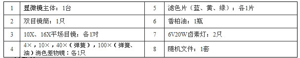 4 | 4×,10×,40×(彈簧),100×(彈簧、油)消色差物鏡:各1只 | 8 | 隨機(jī)文件:1套 |