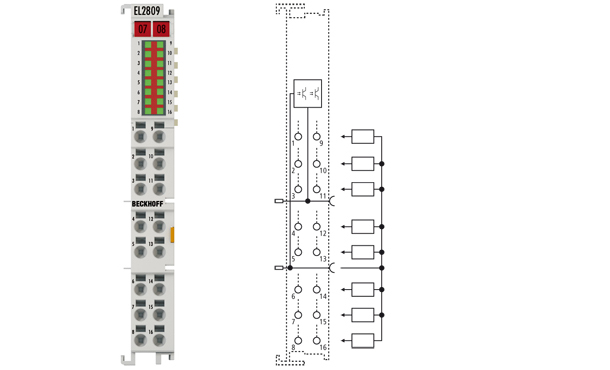 The EL2809 digital output terminal connects the binary control signals from the automation device on to the actuators at the process level with electrical isolation. The EL2809 is protected against polarity reversal and processes load currents with outputs protected against overload and short-circuit. The EtherCAT Terminal contains 16 channels, whose signal states are displayed by LEDs. The terminal is particularly suitable for space-saving use in control cabinets. The connection technology is particularly suitable for single-ended inputs. All components have to use the same reference point as the EL2809. The power contacts are looped through.